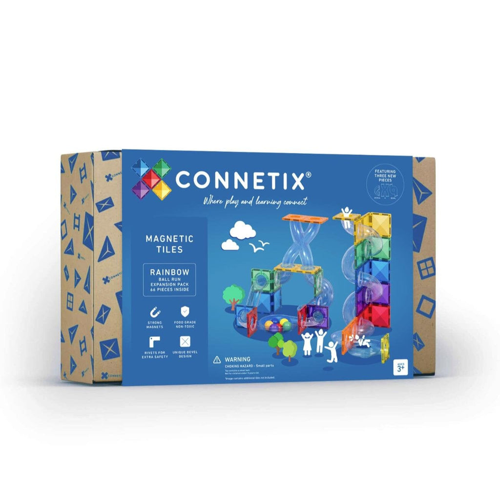 Rainbow Ball Run Expansion Pack 67 stuks van CONNETIX. Til je knikkerbaancreaties naar een hoger niveau en verdubbel het plezier! Met exclusief ontworpen buizen, connectoren en houten ballen, daagt de CONNETIX 66-delige uitbreidingsset je innerlijke ingenieur zeker uit om grotere, spannendere ontwerpen te maken. Met deze uitbreidingsset verken je beweging en zwaartekracht als nooit tevoren!