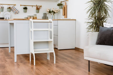 Met de learning tower heb jij je handen vrij en kan jouw kindje op een rustige manier een flesje afwassen, een boterham smeren, handjes wassen of gewoon gefascineerd observeren aan het aanrecht - zo motiveer én betrek je je kindje in de dagelijkse eenvoudige activiteiten en groeien ze verder in hun autonomie en ontwikkelen ze betrokkenheid en zelfzekerheid.