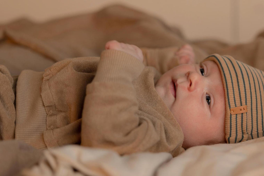 Tof Hat in de kleur Moss Stripe van Nixnut. Dit unisex mutsje is gemaakt van superzacht GOTS-gecertificeerd ribkatoen met elastaan voor extra comfort rond het hoofdje. Het mutsje heeft een groen streepje in de kleur ‘Moss’. Het leren Nixnut labeltje is aan het mustje bevestigd. Nog leuker in combinatie met de bijpassende Tof Onesie.