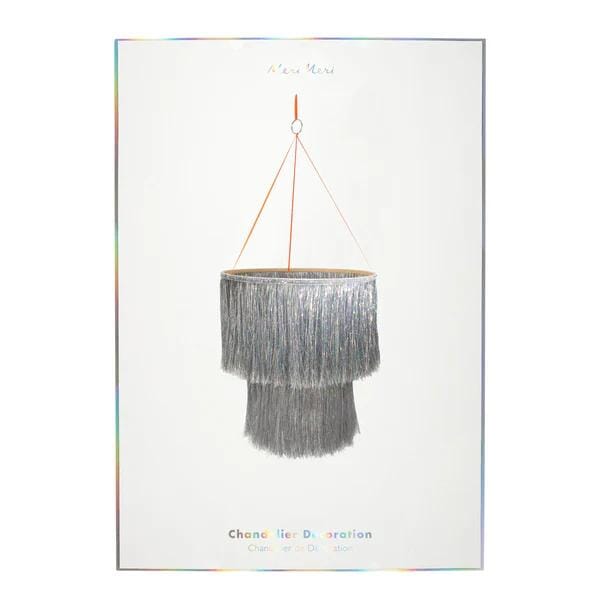 Kroonluchter in zilveren tinsel van Meri Meri. Deze prachtige kroonluchter geeft glans aan elk feest. Prachtig gemaakt van zilverkleurig klatergoud met fluwelen details en koord.