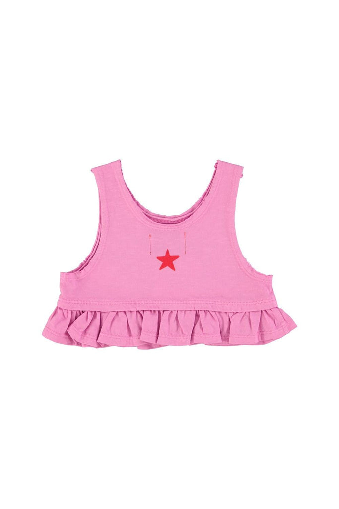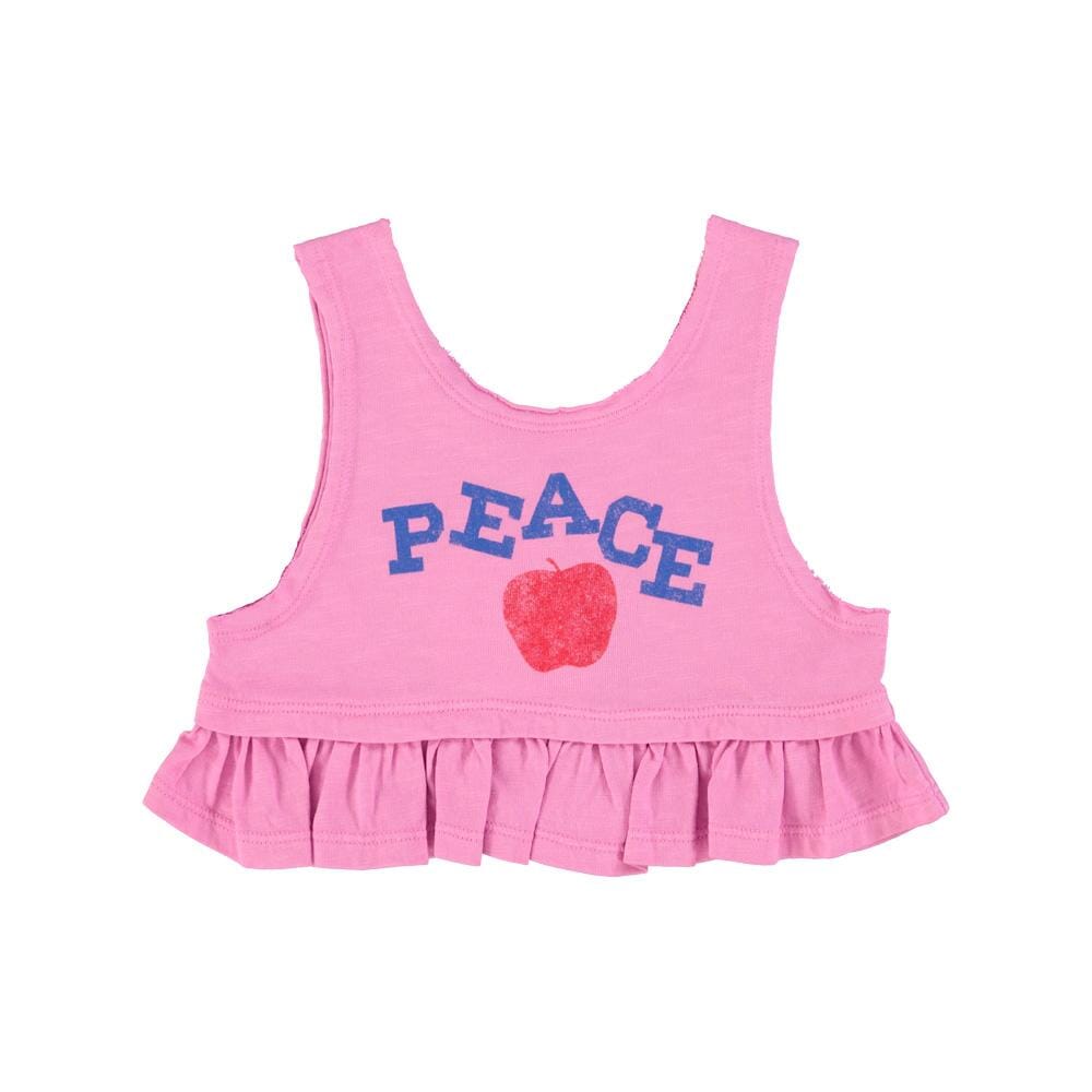 Top met ruches van Piupiuchick. Deze top heeft een "peace"-print op de voorkant en een ster met logo aan de achterkant.