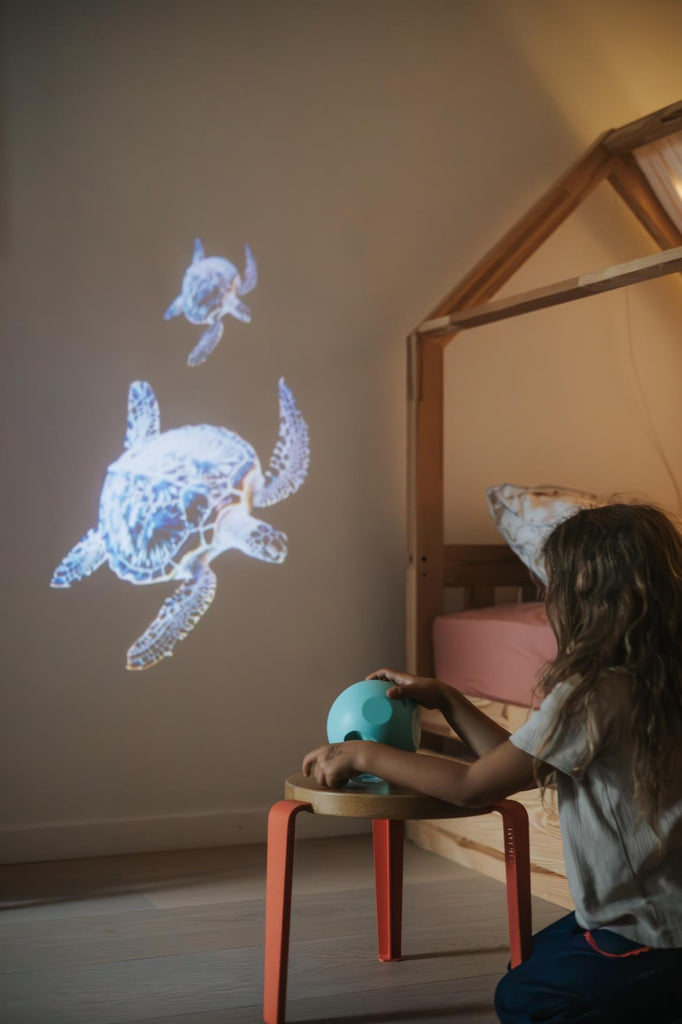 Kidystar Planetarium-Bildprojektor in der grünen Ozean-Version von Kidywolf. Bringen Sie mit KIDYSTAR Magie in das Schlafzimmer Ihres Kindes! Dieser magische Projektor verwandelt Wände und Decken dank seiner 6 austauschbaren Scheiben in ein magisches Lichtspiel. Das illustrierte Lehrheft weckt die Neugier und sorgt für einen ruhigen Schlaf. Eine Einladung zum Entspannen, Träumen und Entdecken ... für süße Nächte.