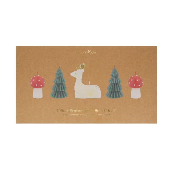 Kaarsen Winter Woodland van Meri Meri. Creëer een prachtige winterse bosscene met deze prachtige kaarsenset. De set bestaat uit een rendierkaars, kerstboomkaarsen en paddenstoelkaarsen met opvallende rode lanken. Steek ze aan voor ultieme gezelligheid of gebruik ze als decoratie en herbruik ze jaar na jaar.
