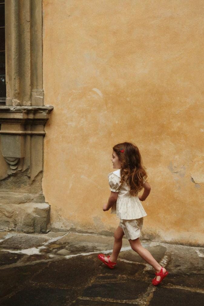Watersandalen van Konges Sløjd. De sandaaltjes hebben een praktische velcrosluiting en een glittereffect. Bovenop zit een aardbei met daarin dansende sterretjes!