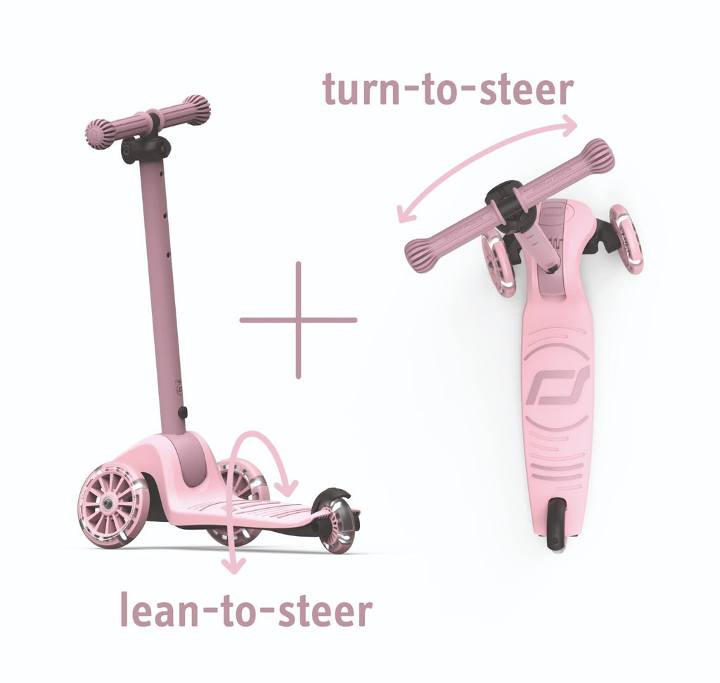 Scooter Highwaykick 3S in de kleur Rose van Scoot and Ride. Het bijzondere aan deze kinderstep is het dubbele stuursysteem: de step kan worden bestuurd met het klassieke draaistuur of door het gewicht te verplaatsen. Hierdoor is hij gemakkelijker en veiliger te besturen. Dankzij het in drie standen verstelbare stuur, groeit de step met je kind mee en biedt hij jarenlang rijplezier. Het nieuwe vouwmechanisme maakt het inklappen van het stuur kinderspel, waardoor de step gemakkelijk en compact kan worden opgeborgen en vervoerd.