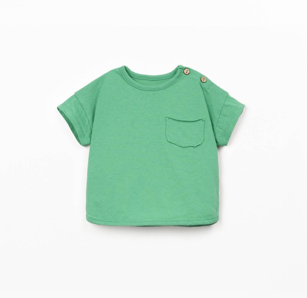 T-shirt in mintgroen van Play Up. Dit T-shirt heeft een ronde halslijn, korte mouwen, een borstzakje en een schouderopening met knoopjes van kokosnoot.