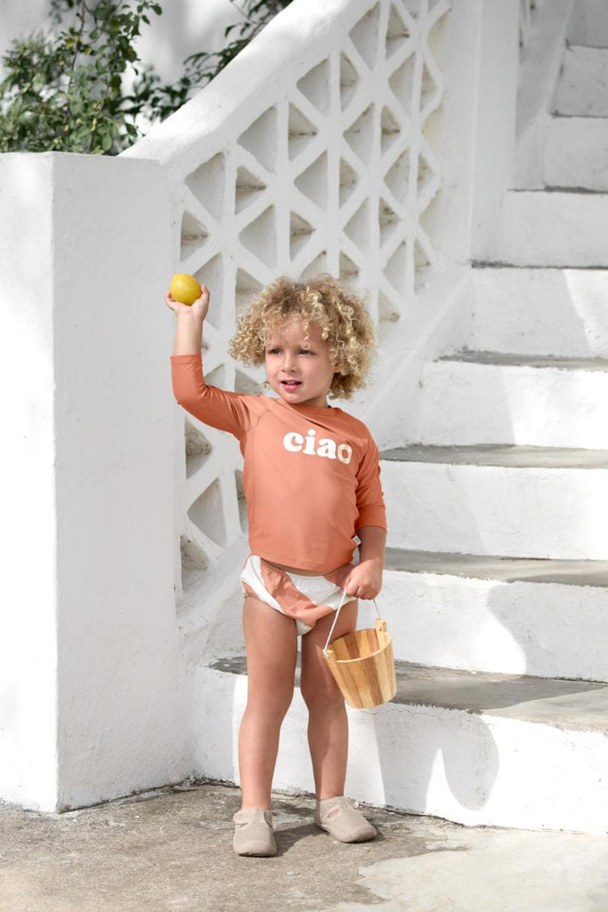 Zwemluier met strepen in de kleur Clay Sea Salt van Lässig. De herbruikbare LÄSSIG zwemluier met UV-bescherming brengt een vleugje Italië naar kleine zonaanbidders en garandeert zorgeloos plezier in het water. Zomer, zon, ijs!