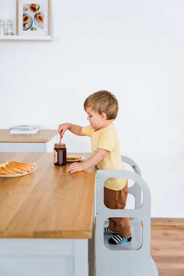 With the learning tower you have your hands free and your child can quietly wash a bottle, make a sandwich, wash hands or just observe fascinated at the counter - this way you motivate and involve your child in the daily simple activities and they grow further in their autonomy and they develop involvement and self-confidence.