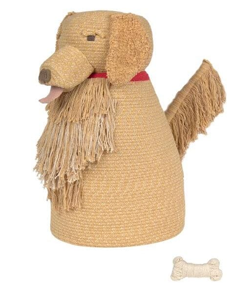 Opbergmand Luna van Lorena Canals. Maak kennis met Luna! Deze handgemaakte mand is geïnspireerd op het silhouet van een Golden Retriever en is gemaakt van gevlochten koorden van gerecyclede PET-flessen, gemengd met het kenmerkende LC-katoen. Het hoofd heeft met canvas gevoerde oren, zorgvuldig met de hand geknoopte ogen met pluizige wenkbrauwen voor een lieve, expressieve blik, en een interactieve snuit met een uitrolbare tong – voor extra speelse momenten! Je kunt de mond openen en sluiten, en de tong rolt eruit, net als bij een vrolijke viervoeter. De franjes aan de voorkant en de kwispelende staart imiteren de pluizige vacht van de hond. De staart is flexibel, wat bijdraagt aan de levensechte, vrolijke uitstraling.
