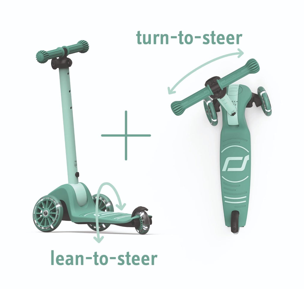 Scooter Highwaykick 3S in de kleur Forest van Scoot and Ride. Het bijzondere aan deze kinderstep is het dubbele stuursysteem: de step kan worden bestuurd met het klassieke draaistuur of door het gewicht te verplaatsen. Hierdoor is hij gemakkelijker en veiliger te besturen. Dankzij het in drie standen verstelbare stuur, groeit de step met je kind mee en biedt hij jarenlang rijplezier. Het nieuwe vouwmechanisme maakt het inklappen van het stuur kinderspel, waardoor de step gemakkelijk en compact kan worden opgeborgen en vervoerd.