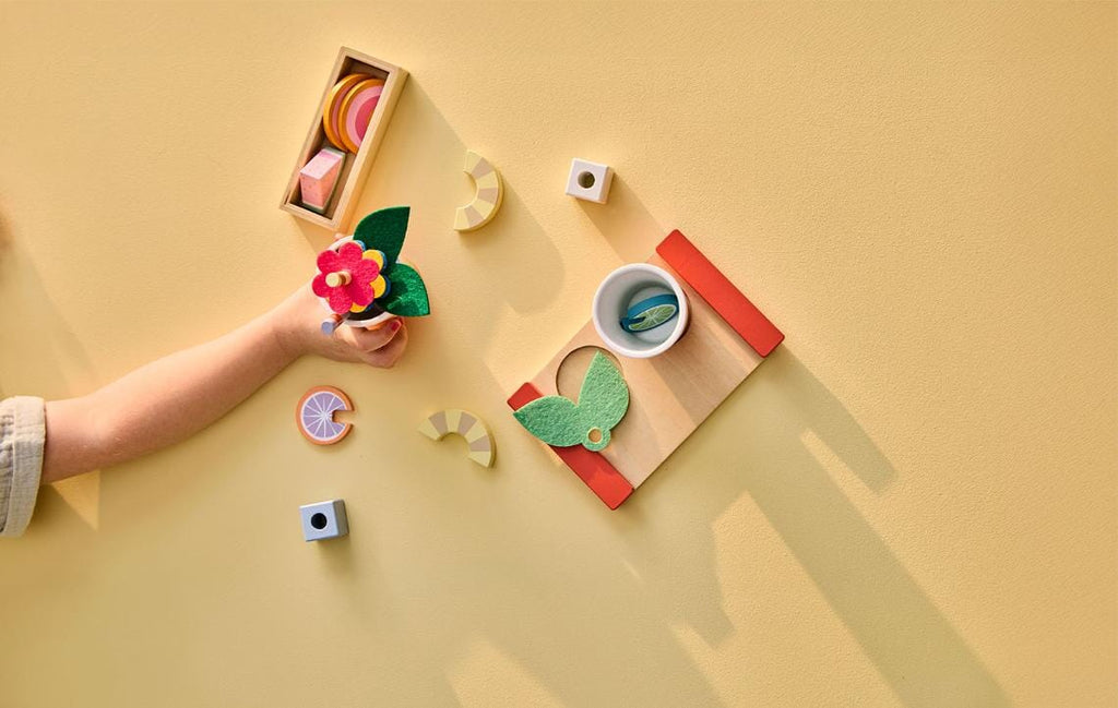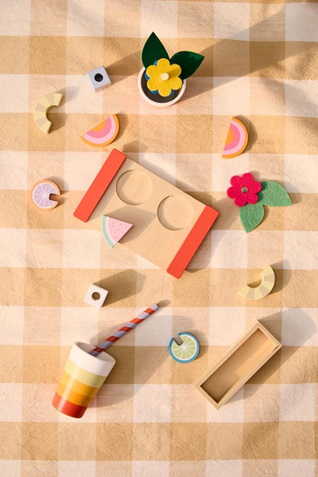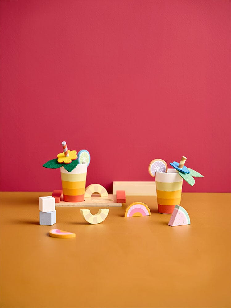 Speelset met feestelijke drankjes van Kid's Concept. Stel je voor dat je je eigen vruchtendranken maakt en verschillende smaken mengt! Met deze houten vruchtendrankenset kunnen kinderen experimenteren met fruit, ijsblokjes, garnering en rietjes om hun favoriete combinaties te maken. Ze kunnen doen alsof ze verfrissende drankjes serveren en alles netjes op het dienblad schikken voor familie en vrienden. De set bevat een dienblad, twee kleurrijke drinkglazen, ijsblokjes, stukjes fruit, drie rietjes en vilten drankgarneringen. Een houten bakje past perfect op het dienblad, zodat alle onderdelen netjes opgeruimd en klaar voor gebruik zijn.