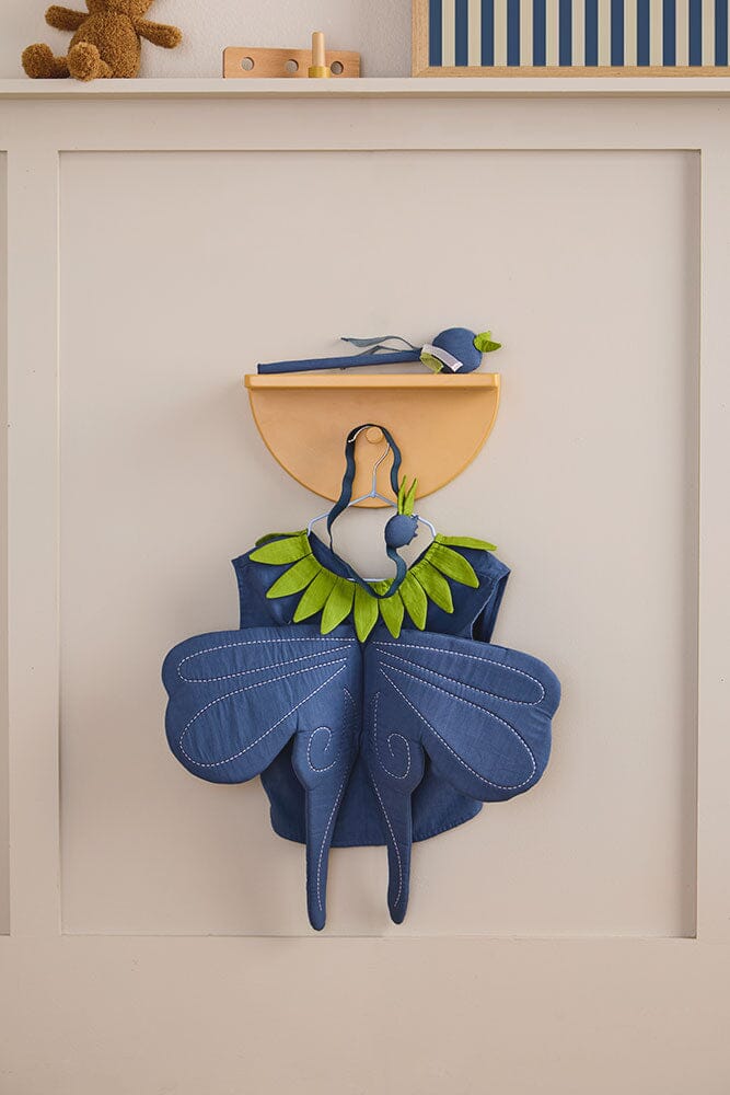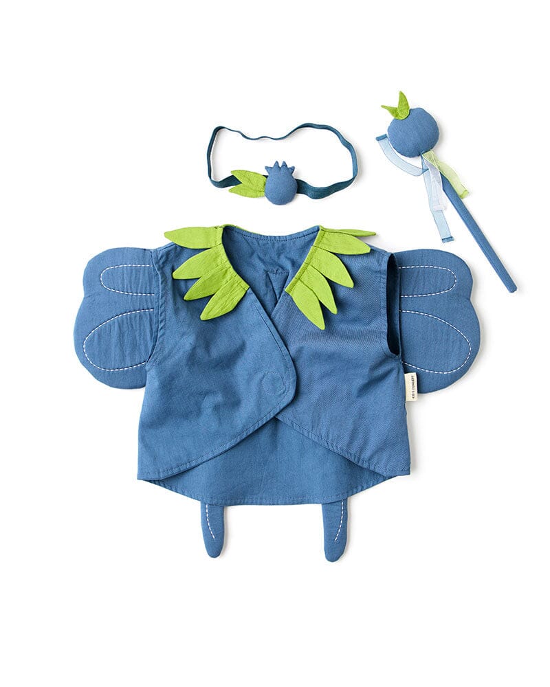 Het bosbessenfee-kostuum nodigt kinderen uit om fantasierijk te spelen, geïnspireerd door het Zweedse bos en alle bosbessen die daar groeien. Het zachte blauwe vest heeft een ronde voorkant en een kraag versierd met groene bladdetails. Aan de achterkant zijn kleine gewatteerde blauwe vleugels bevestigd, die een speels element toevoegen.