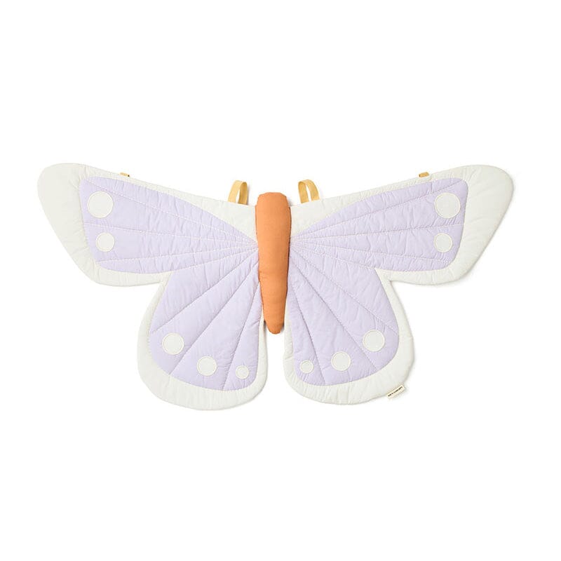 Verkleedpakje Vlinder in de kleur paars van Kid's Concept. Vlinders brengen leven en kleur in tuinen terwijl ze zachtjes van bloem naar bloem vliegen. Met deze vlindervleugels kunnen kinderen die gracieuze beweging nabootsen, met elastische linten voor hun handen, waardoor ze de fladderende beweging van vlindervleugels kunnen imiteren. De vleugels zijn een delicate mix van wit en zacht lila, met een zacht bruin lichaam in het midden, en zijn licht gewatteerd om hun vorm te behouden. Geborduurde details voegen textuur en elegantie toe.