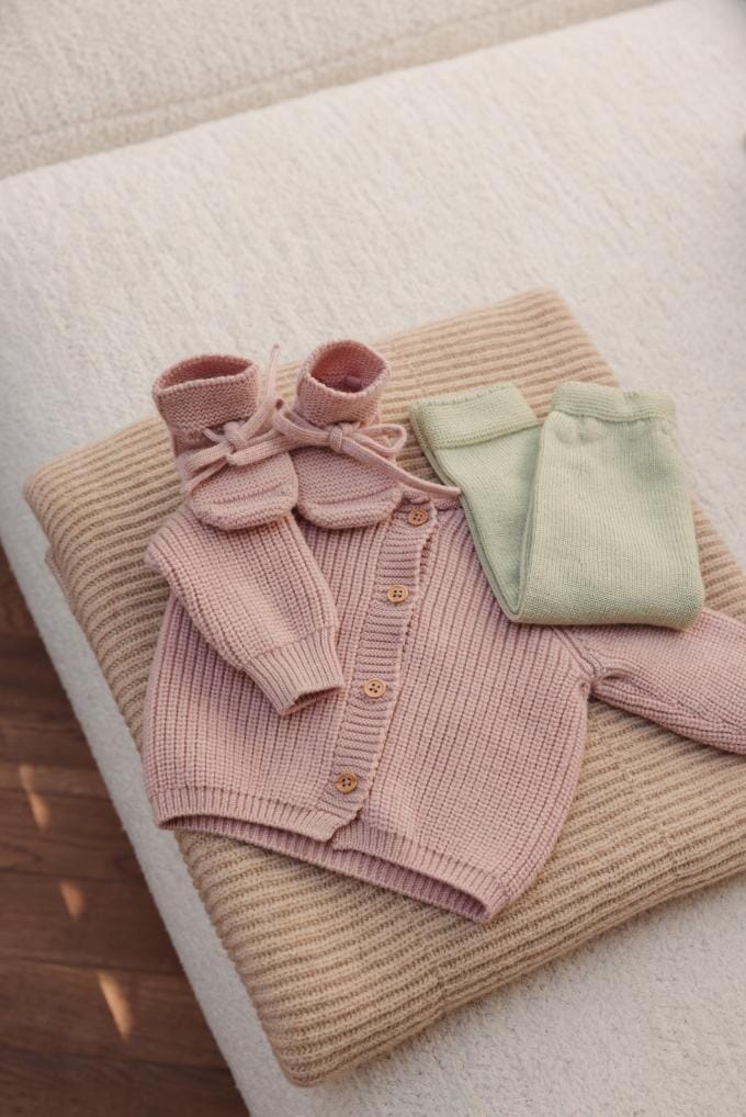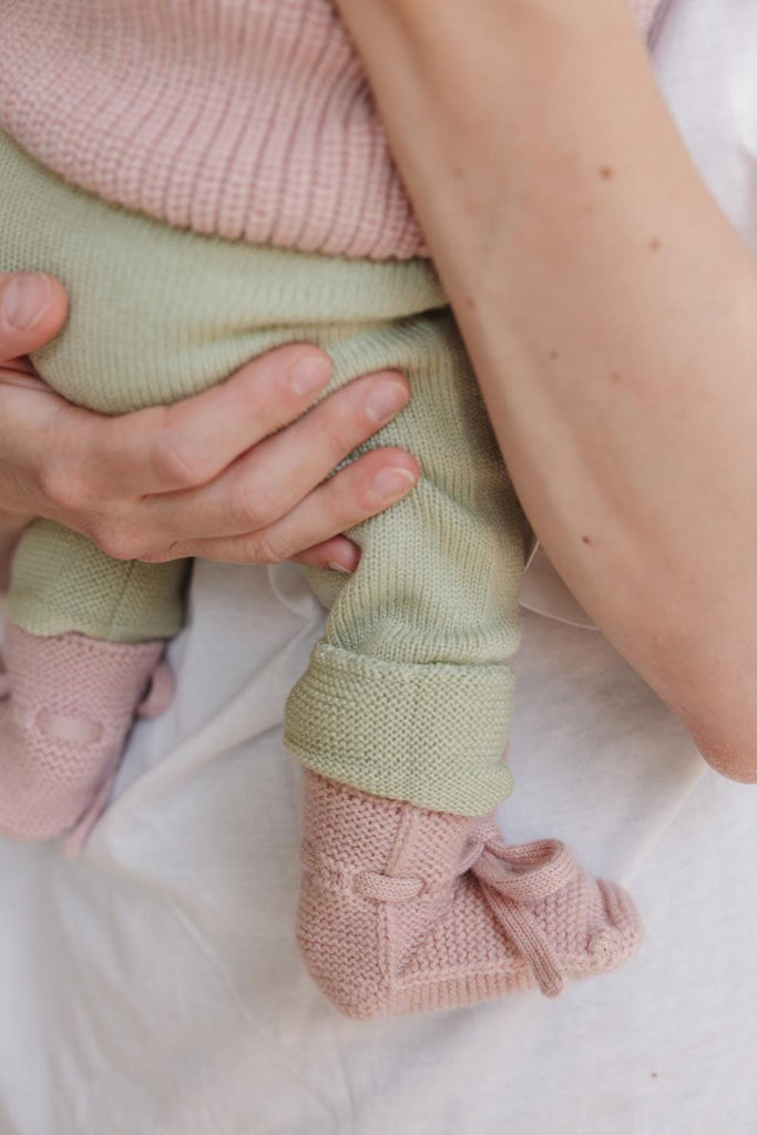 Booties in de kleur Powder van Hvid. Deze gebreide babysokjes bieden een perfecte pasvorm dankzij het unieke hielontwerp van Hvid. De vastgenaaide veters zorgen ervoor dat ze stevig aan babyvoetjes blijven zitten en makkelijk aan te trekken zijn. Gemaakt van merinowol, reguleren ze de temperatuur, zodat de voetjes het hele jaar door aangenaam warm blijven. Verpakt in een katoenen zakje, zijn deze sokjes een ideaal cadeau voor elke baby.