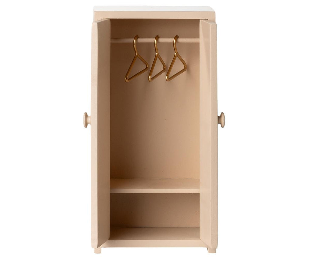 Kast op muizenmaat in de kleur Light rose van Maileg. Deze compacte kast helpt de muizenfamilie om hun garderobe te organiseren. Bij de kast zijn drie goudkleurige kleerhangers inbegrepen.