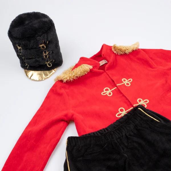Soldaat verkleedpakje van Meri Meri. Deze geweldige outfit, gemaakt van weelderig fluweel en pluche, zit zo gemakkellijk en is zacht om te dragen. Dit kostuum is gemaakt uit 3 stuks - een hoed, jas en broek. De hoed is gemaakt van zachte zwarte pluche met een gouden leerpiek, goudfluweel elastiek met een haak en lusbevestiging en een zwarte polycotton voering. De jas is gemaakt van luxueus rood fluweel met een rode polycotton voering, gouden koorddetails, gouden franjes epauletten en een gold tone snapbevestiging. De elastische broek is gemaakt van stijlvol zwart fluweel met een zwarte polycotton voering en gouden koorddecoratie.